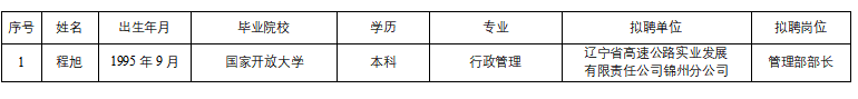 根據(jù)《關(guān)于錦州分公司開展管理部部長(zhǎng)公開遴選工作的通知》要求,經(jīng)資格審核、面試等程序,確定程旭同志為實(shí)業(yè)公司錦州分公司管理部部長(zhǎng)擬聘人選,現(xiàn)予以公示。