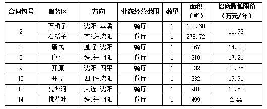 2.2招商范圍及合同包劃分:本次招商業(yè)態(tài)為石橋子、那四、開原服務(wù)區(qū)雙側(cè)餐廳共計6個;高花(沈陽—北京方向)餐廳1個、新民(通遼—沈陽方向)餐廳1個、康平(鐵嶺—朝陽方向)餐廳1個、康平北(康平—沈陽方向)餐廳1個、朝陽(朝陽—鐵嶺方向)餐廳1個、鐵嶺(四平—沈陽方向)餐廳1個、復(fù)州河(大連-沈陽方向)餐廳1個,彰武(朝陽-鐵嶺)餐廳1個,桃花吐(鐵嶺-朝陽)餐廳1個,本項目共劃分為14個合同包。