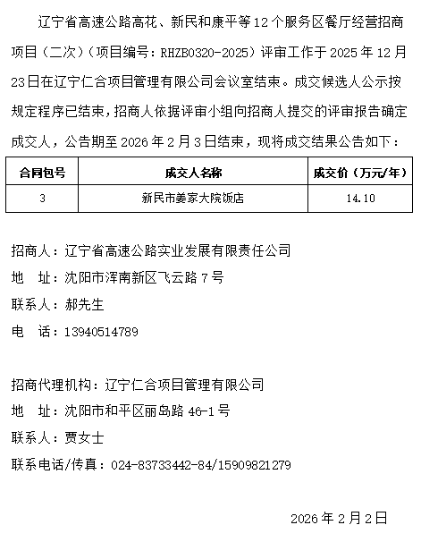 遼寧省高速公路高花、新民和康平等12個服務(wù)區(qū)餐廳經(jīng)營招商項目(二次)成交結(jié)果公告